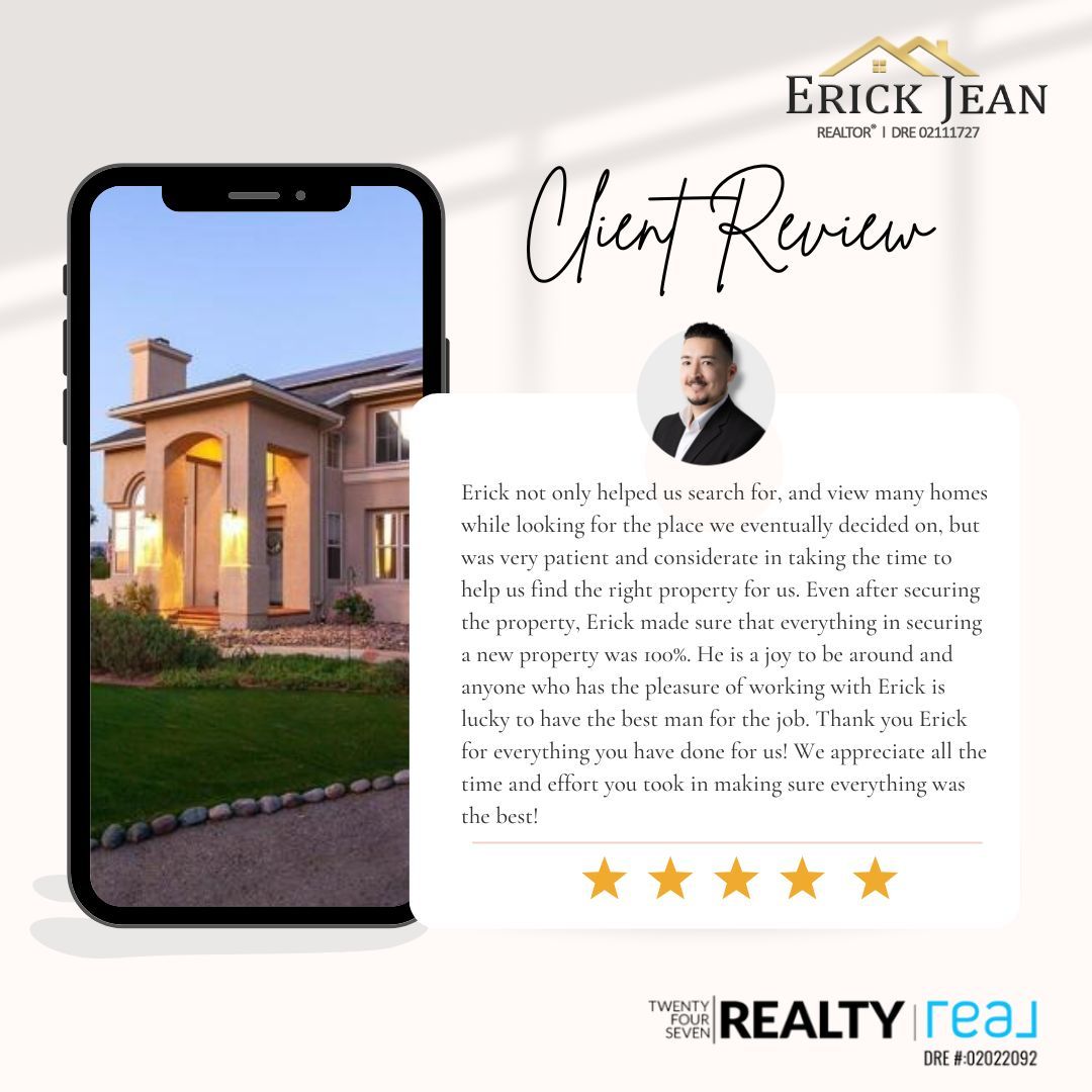 "Erick not only helped us search for, and view many homes while looking for the place we eventually decided on, but was very patient and considerate in taking the time to help us find the right property for us. Even after securing the property, Erick made sure that everything in securing a new prooerty was 100%. He is a joy to be around and anyone who has the pleasure of working with Erick is lucky to have the best man for the job. Thank you Erick for everything you have done for us! We appreciate all the time and effort you took in making sure everything was the best!"